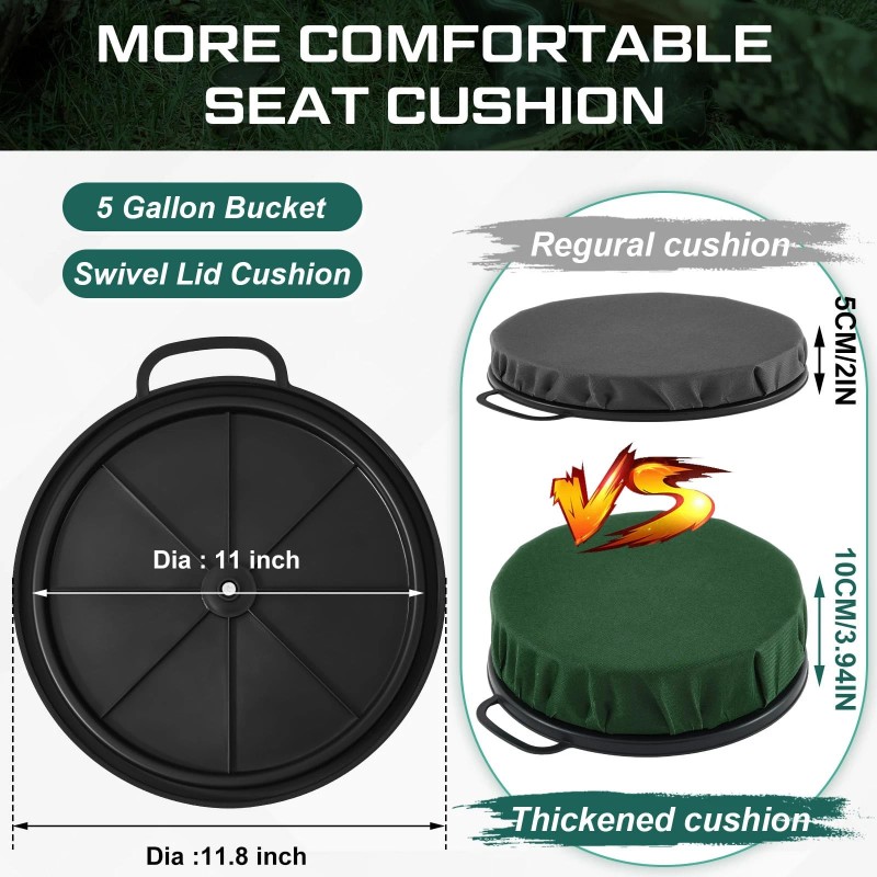 Multi functional Utility: the 5 gallon bucket lid seat functions as a seat cushion for your buckets during outdoor events, a comfortable swivel seat for ice fishing, camping, gardening, car washing, hunting and more