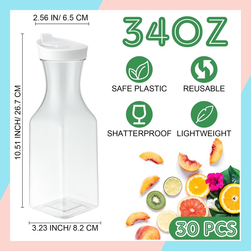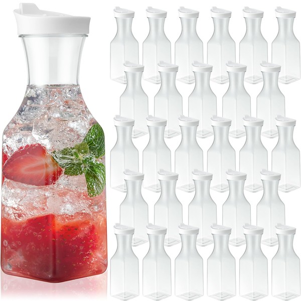 Reallnaive 30 Packs Plastic Carafe with Lids, 34 oz Clear Mimosa Juice Containers, Acrylic Beverage Carafe Pitcher Drink Containers for Fridge Outdoor Iced Tea Juice Party Mimosa Bar (Stylish)