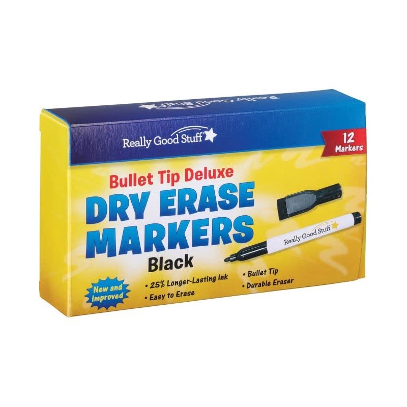 - 12 Blank Magnetic Boards and 12 Deluxe Dry Erase Markers: With this versatile dry erase set, students can solve math problems, write sentences, build words with magnetic letters, and more. These 12 bo