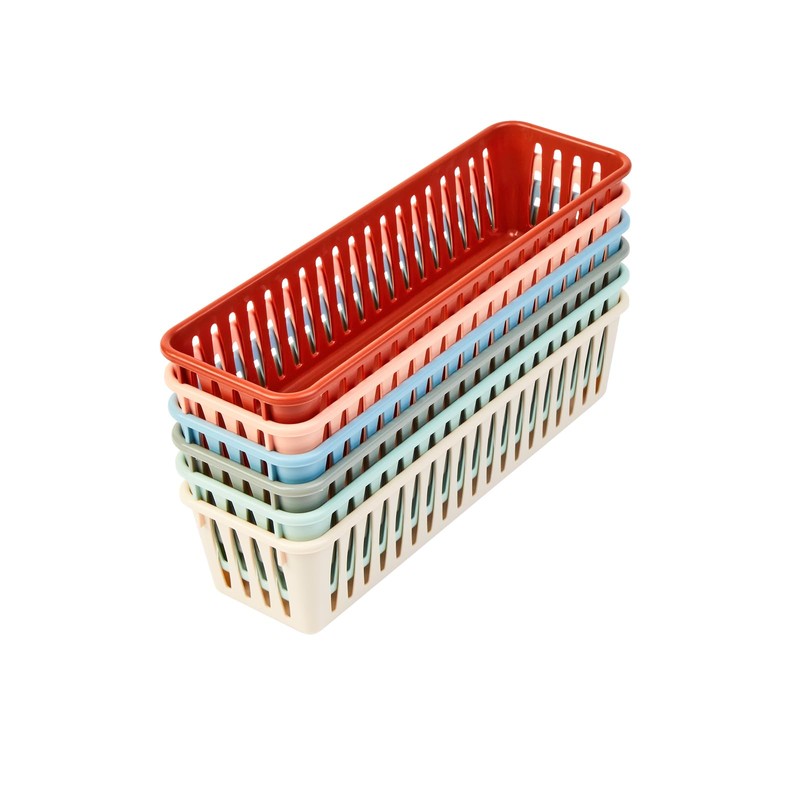 - WHAT YOU GET: 6 Pencil Baskets in Boho colors, 1 each of smoke blue, mint, peach, sand, tan, and clay. Each plastic mesh storage basket measures 3?"W by 10"L by 2?"H.