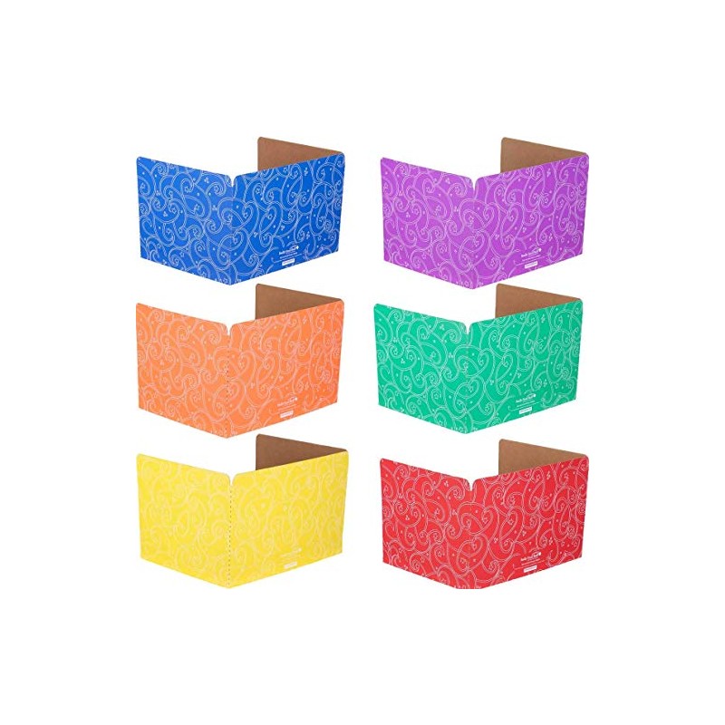 - STYLISH AND USEFUL: Includes (12) three-panel sturdy corrugated cardboard privacy shield. They are printed with whimsical stars and swirl pattern in a classic red, blue, green, yellow, orange and purple. Each pack includes 2 of each color. The center panel is 19" x 14" and the two side panels are 12" x 14" each.