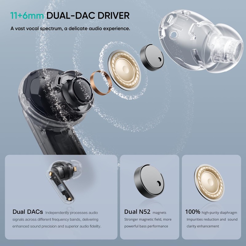 - ULTRA CLEAR SOUND QUALITY 11mm woofer and 6mm tweeter, with dual DAC audio processing chip and dual N52 iron-boron neodymium iron boron magnets with extremely high magnetic energy, the sound output is more precise and real, and the bass performance is more impressive.