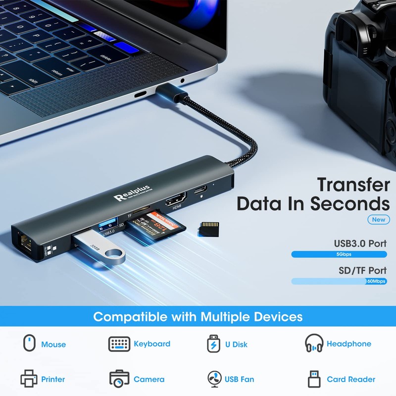 - [7-IN-1 USB-C HUB] - One Type-C port gives you access to 7 powerful functions: 1000M Ethernet, 2 USB 3.0, 4K HDMI, 100W PD, SD/TF card slot. The RealPlus Multi-Port USB-C Hub offers you new ways to easily solve your daily work and entertainment needs.