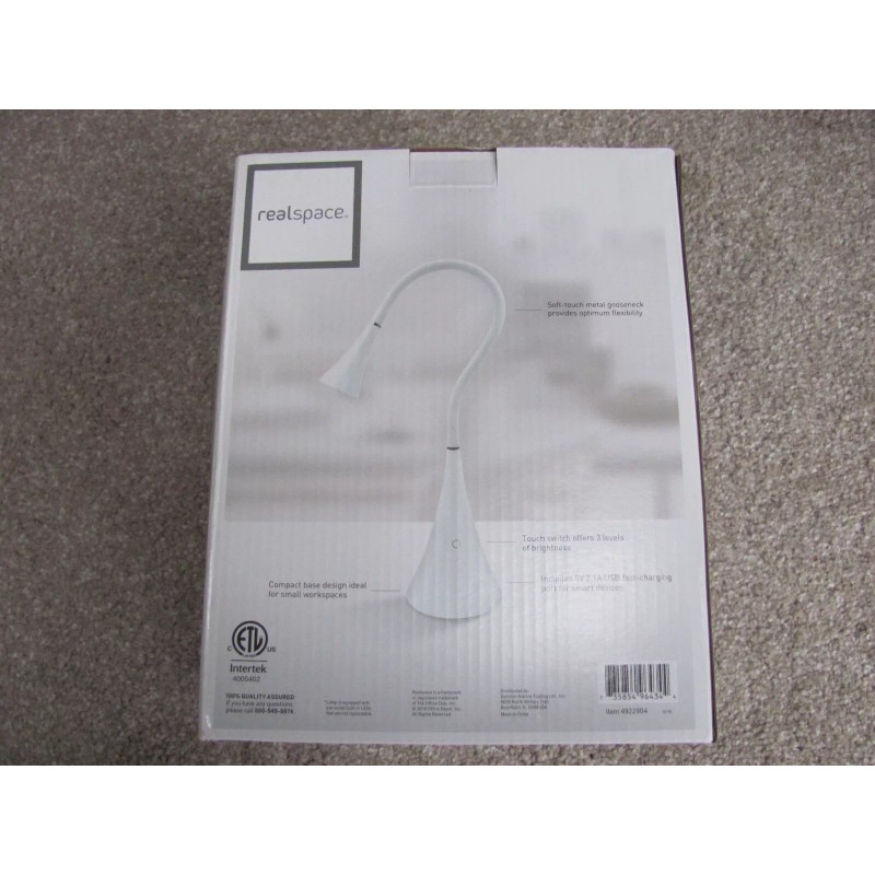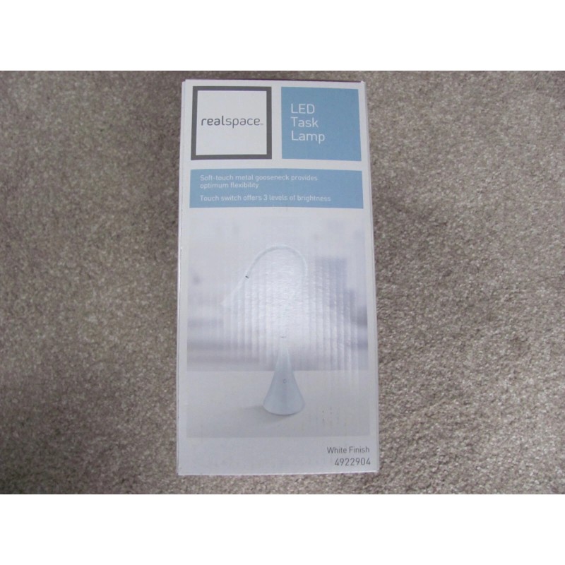 Addefficient lighting to your workspace with this white Realspace gooseneck LEDtask lamp. The touch switch has three levels for versatile brightness levels,while the 3W LEDs provide a maximum of 35,000 hours for long use. Thiscone-shaped Realspace gooseneck LED task lamp delivers a stylish look, and thesoft-touch metal neck lets you change the light direction easily.