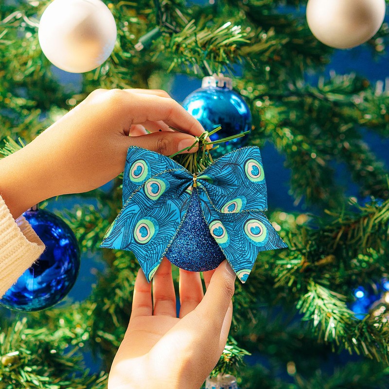 - Peacock Design: Elevate your holiday decor with the regal elegance of peacock-inspired ornaments! This set of 12 exquisite Christmas bows features peacock green color, capturing the majestic beauty of a peacock's plumage. Perfect for trees, gifts, or entryways, they add a touch of sophisticated artistry and natural grace to your festive celebrations