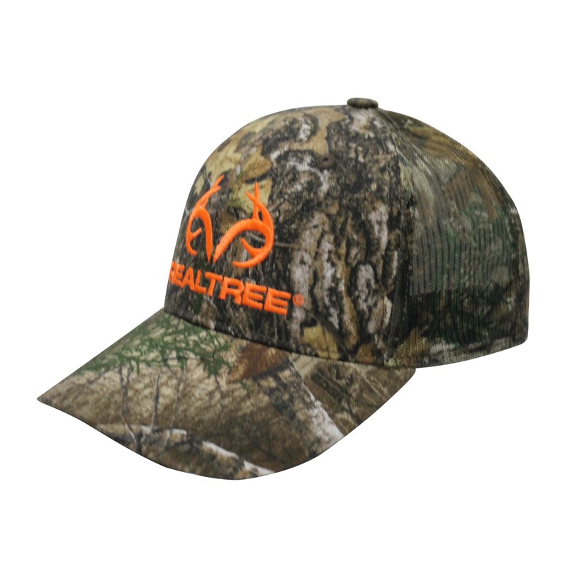 - Popular Mid Profile, Structured, Precurved Bill, Realtree Edge camo pattern (front and mesh back), Blaze Orange Embroidery Realtree Logo; 6 Panel, Plastic Snapback, Q-3 Wicking Narrow Sweatband.
