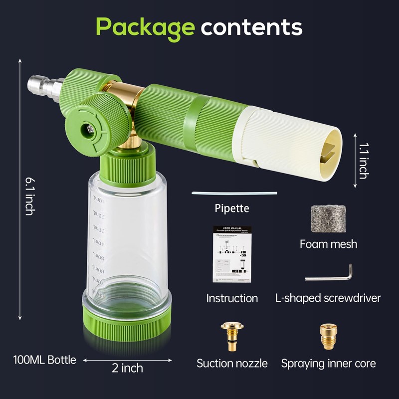 - New design: The new foam monitor can be directly added with car wash fluid, so you can immediately enjoy the strong foam effect without worrying about the mixing ratio. The adjustment button is added to control the foam concentration. Equipped with a straw, it can be used like a regular foam pot. Do whatever you want and enjoy the ultimate car washing experience