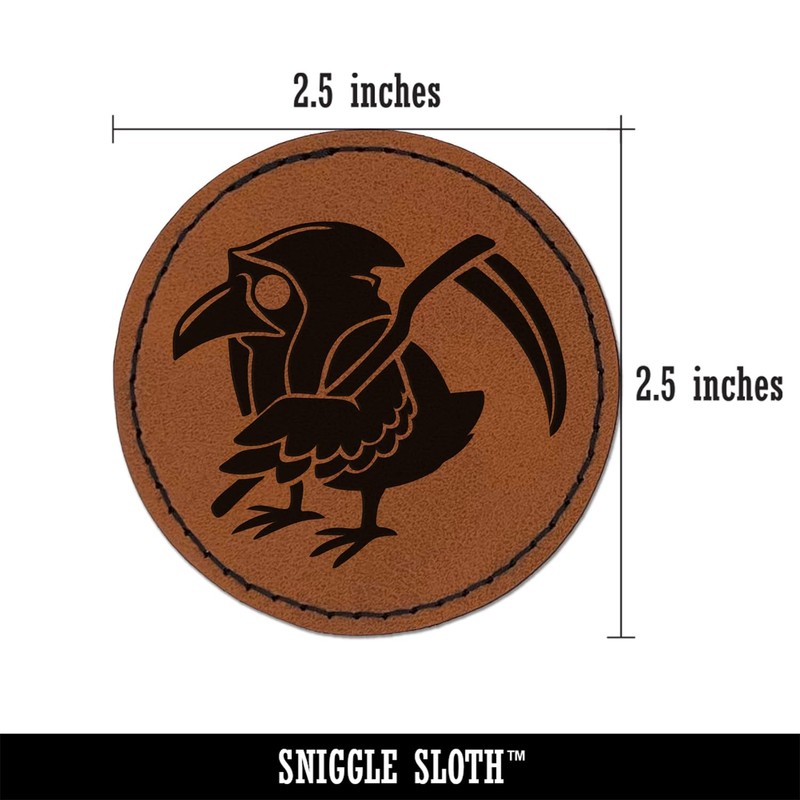 Reaper Raven Hood Scythe Round Iron-On Engraved Faux Leather Patch Applique - 2.5 Inch - Brown