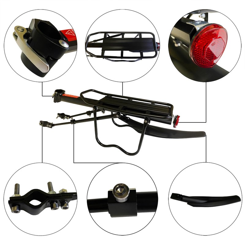 - High Quality:The bike rear rack is made of high quality and strength aluminum alloy. It's strong and lightweight but carries lots of weight up to 110 lbs.