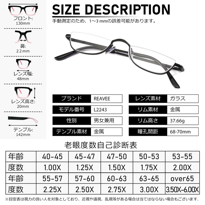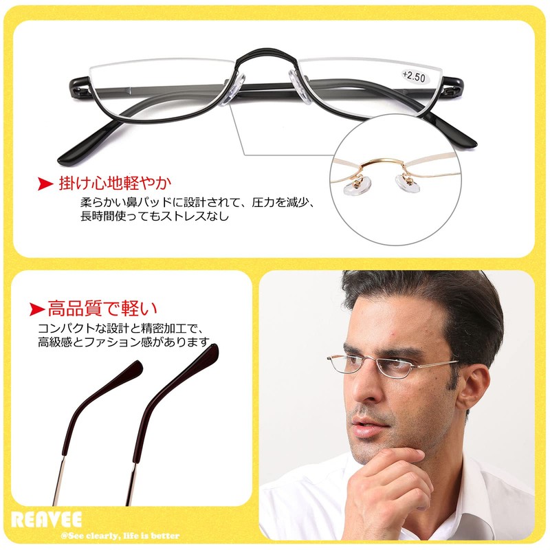 [REAVEE] 老眼鏡 ハーフフレーム 半月型 メタル 薄型 軽量 男女兼用 おしゃれ ケース付き 度数 「+1.5」 ガンブラック
