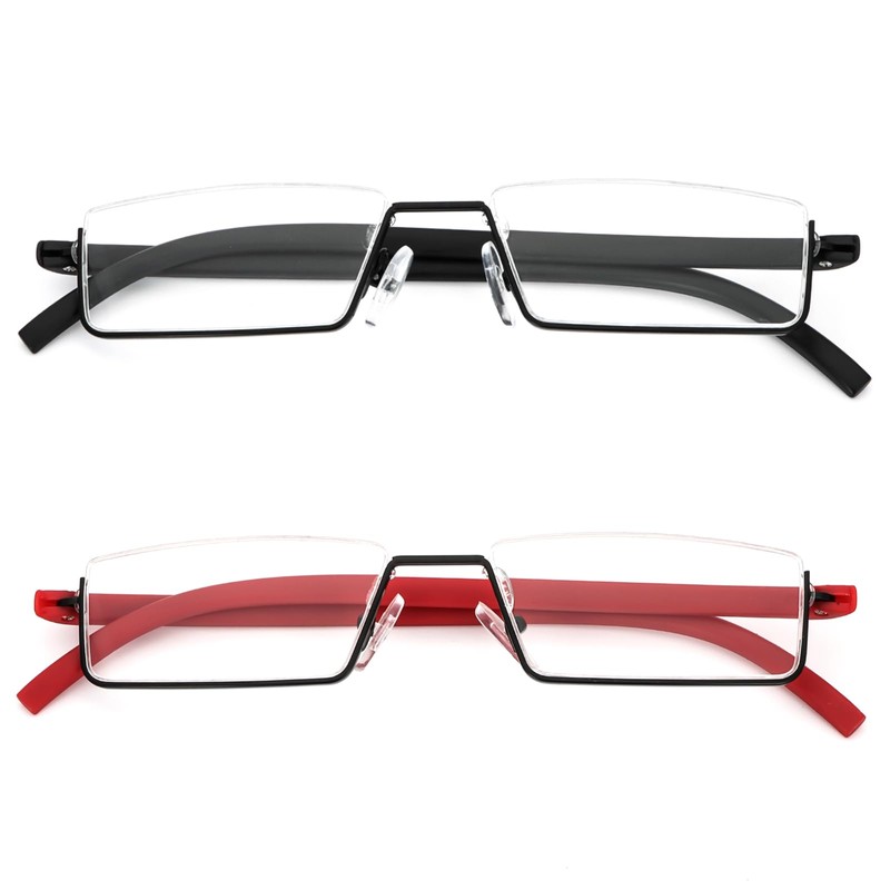 REAVEE 2 Pack Half Reading Glasses for Women Men, Lightweight Half Frame Slim Metal Readers with Portable Case, Black and Red +1.75