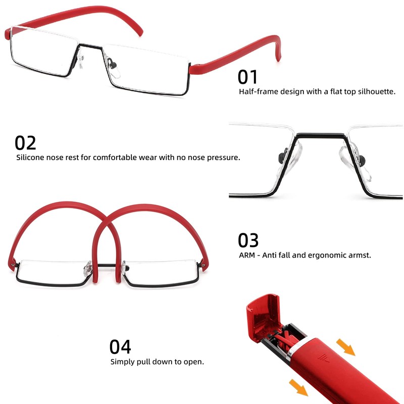 - Half-frame Design: Instead of the traditional full-frame design, no need to take your glasses on and off frequently, and you can see far away with a simple movement of lifting your eyes, perfect for switching between reading glasses and naked eyes.