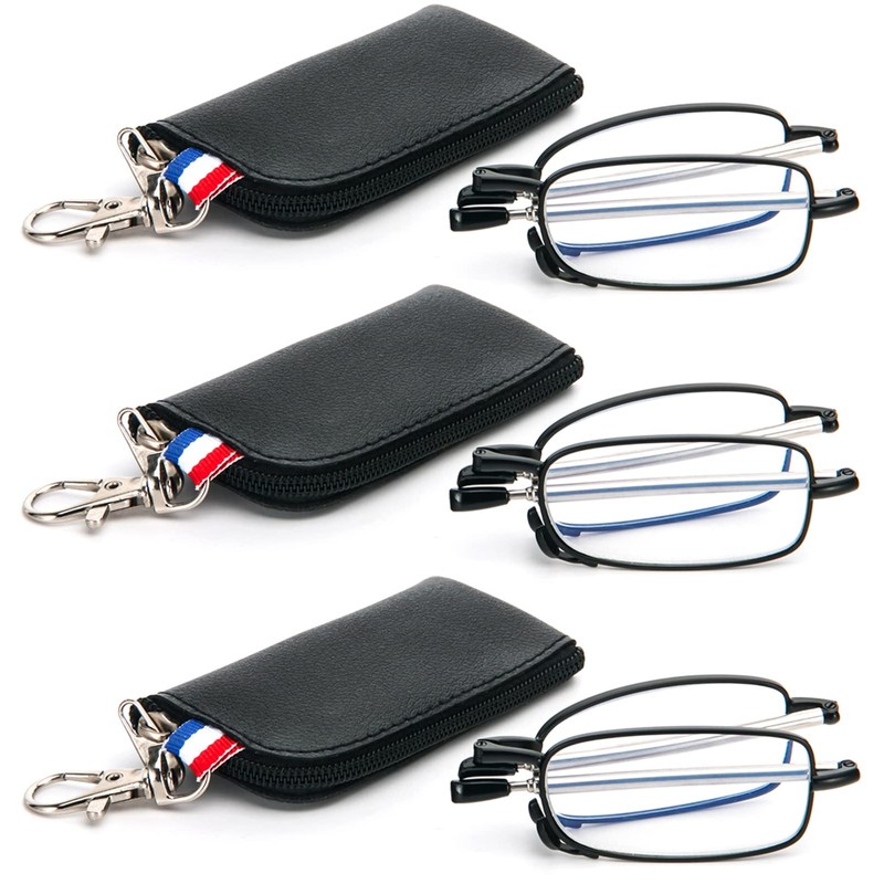 REAVEE 3 Pack Folding Reading Glasses with Keychain Compact Bags Women Men Blue Light Blocking Spring Hinge Portable Pocket Readers,Black 1.5