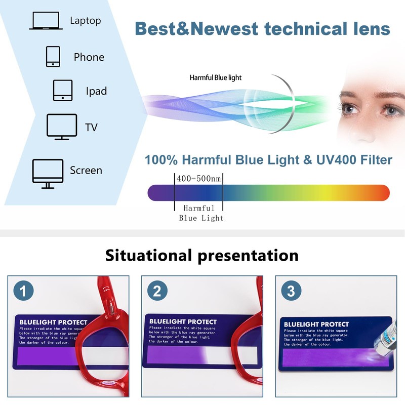 • Anti Blue Light Glasse - Blue light blocking lenses with UV400 protection block more than 95% of harmful blue light, reducing exposure to blue light from digital electronics and reading. Keep away from visual fatigue, headache, blurred vision and sleep disturbance.