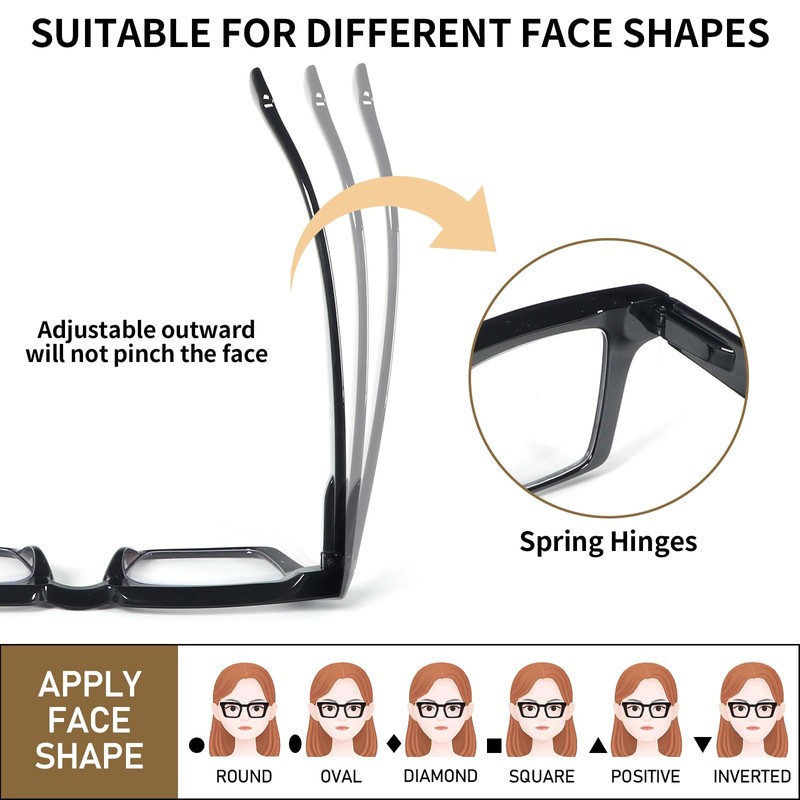 - Durable & Clear - Comfortable big frame with reinforced arms for max durability. Spring Hinge helps reduce pinching and stress, making them suitable for different face shapes. Clear and scratch resistance lens provides clear vision.