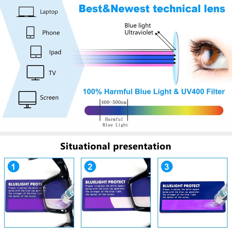 - Anti Blue Light Lens - Blue light blocking lenses with UV400 protection block more than 95% of harmful blue light, reducing exposure to blue light from digital electronics and reading.