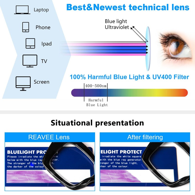- Anti Blue Light Glasses: Our anti-blue light lens added blue light factor into the lens base material to block blue light more effectively.You don't need to worry that the long-term use or scratches will reduce the anti-blue light effect.