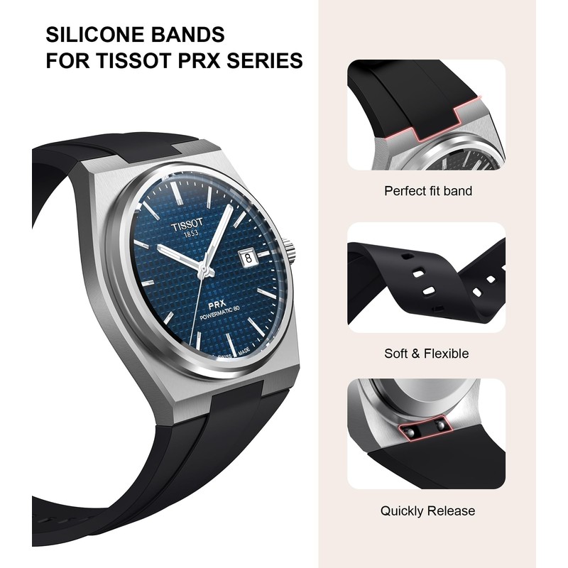 - UNCOMPROMISED QUALITY Our Tissot PRX watch straps have been crafted with precision and durability and are made of high quality liquid silicone and stainless steel buckle materials. If you want a silicone strap for your Tissot PRX watch, our selection guarantees exceptional quality.