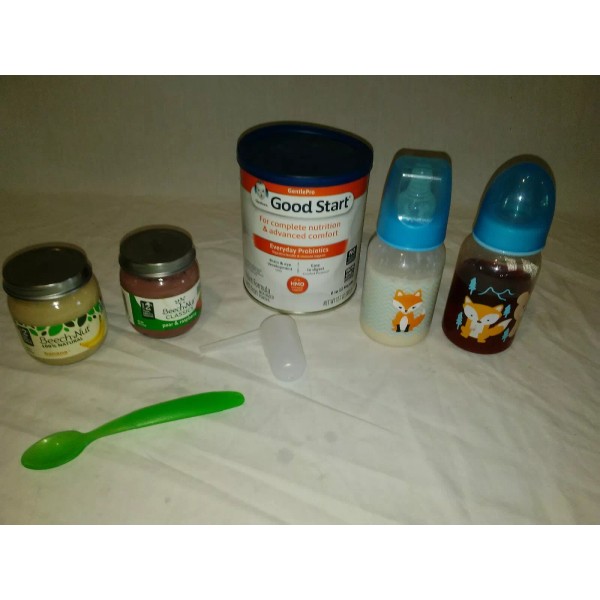 Reborn Baby Feeding Kit.kit includes fake milk and juice bottle fake fruit and vegetable beach nut food jars a empty can of formula with scoop and a spoon all bottles and food jars are sealed bottles and jars may be different then pictures in photos can also do girl bottles if requested