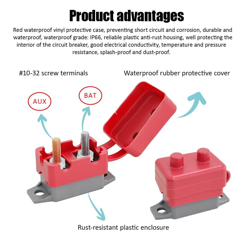 • Premium Material: The breaker is made of quility material, red vinyl waterproof protective cover avoids electrical short circuit and corrosion, waterproof plastic rustproof housing, can well protect the internal circuit breaker, good electrical conductivity