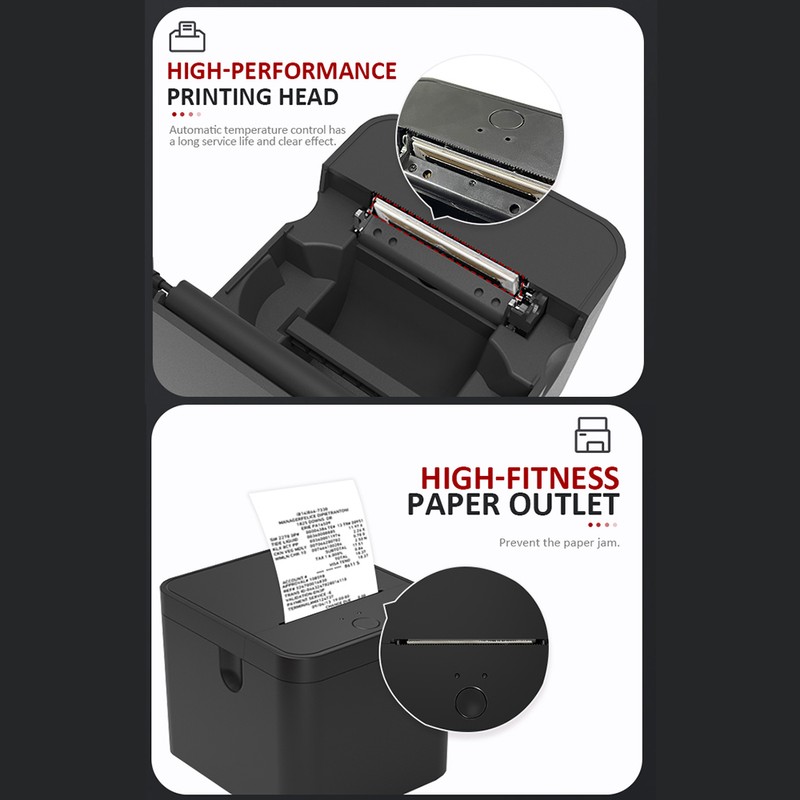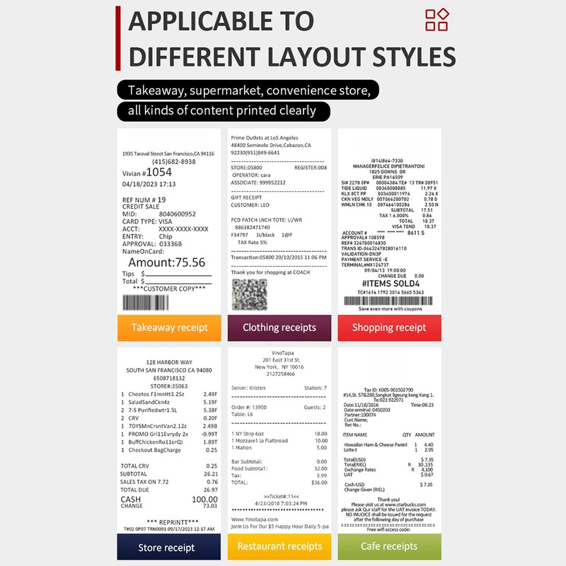 1、Portable Design: Compact size and light weight make this printer great for mobile use, making it easy for merchants to print receipts at any location and improve work efficiency. 2、Fast Printing: Adopting thermal printing technology with high speed printing capability, providing customers with a smoother service experience without waiting. 3、Multiple Connectivity: Supports BT, USB connectivity, can be conveniently connected to existing devices to meet different usage scenarios. 4、Premium printing: Prints clear text and barcodes to ensure accurate receipt information, strong durability and not easy to fade. 5、Energy Saving Design: The use of thermal paper as a consumable eliminates the need for ink and ribbons, reducing maintenance costs, while the thermal technology also achieves low energy consumption, in line with modern environmental trends.