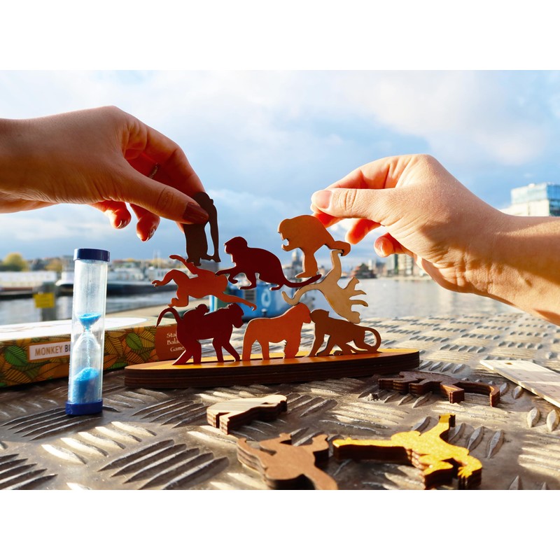 - Beautifully made wooden puzzle complete with sand timer and ruler to measure which player can make the taller monkey tower!