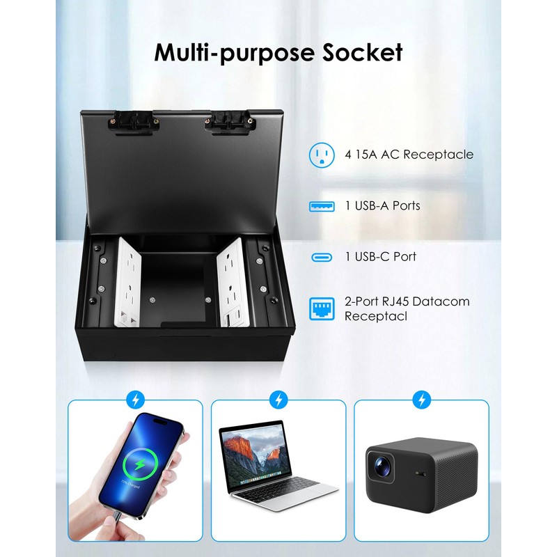 - Multifunctional Floor Socket: Embedded socket is equipped with 4 15A AC Receptacle, 1 USB-A Ports & 1 USB-C Port and 2-Port RJ45 Datacom Receptacle, providing power and charging support for multiple devices at the same time