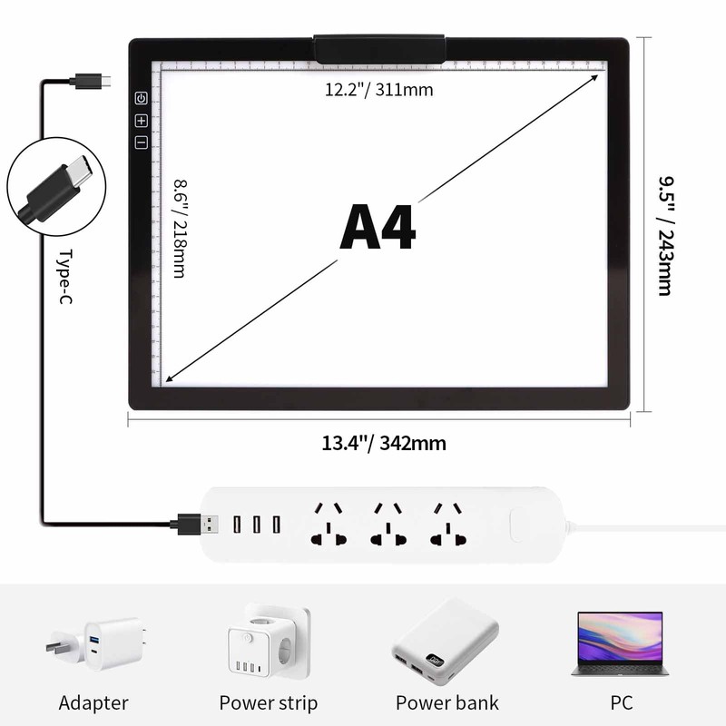 - 💎〖TYPE-C CHARGING PORT〗The A4 diamond painting light board comes with a Type-C power port, equipped with a cable with a USB port on the other end, which can be plugged into a computer, mobile power, car adapter, USB wall charger or any device equipped with a USB port for charging.