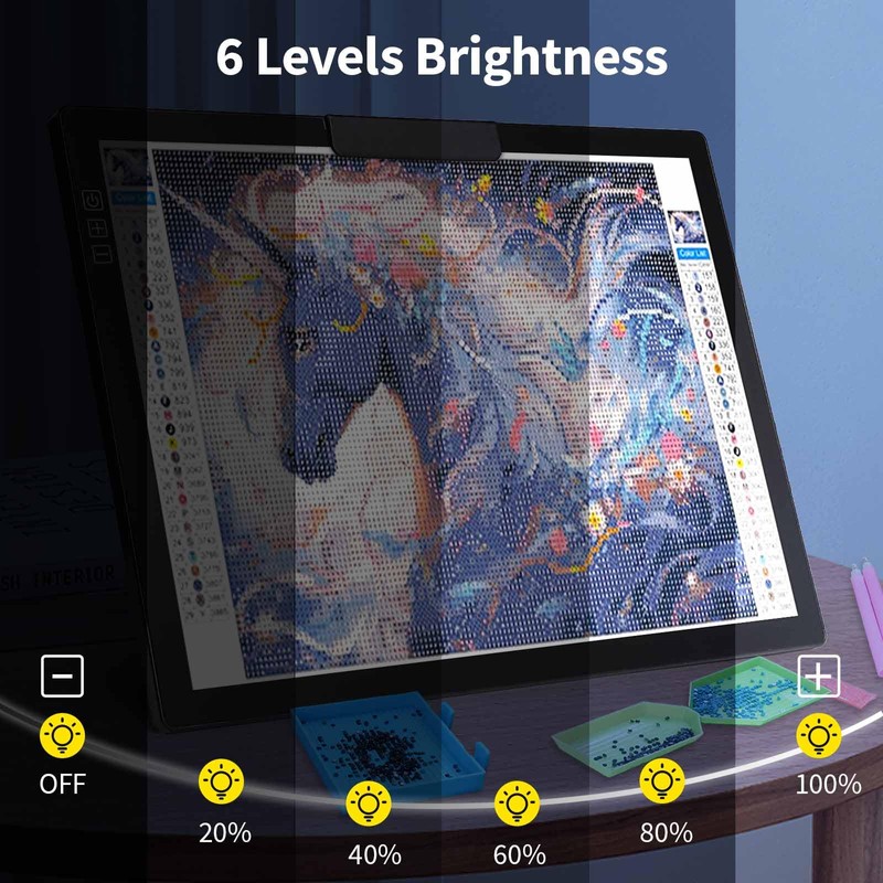 - 💎〖6-LEVELS / STEPLESS DIMMING〗This light board for diamond painting has 6 brightness levels and 2 dimming methods, the adjustable range of brightness is 390-2140Lux, single press button “+” or “-” can adjust the brightness step by step, long press button “+” or ‘-’ can realize stepless brightness adjustment, you can adjust the light table light according to the ambient light and paper thickness/weight to suit your project.
