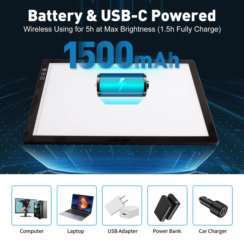 - 【 Battery and USB-C Powered 】 The light tracing box let you enjoy the convenience of working wirelessly at anywhere you like with the built-in battery. This rechargeable light pad can work for approx 5 hours after fully charged(1.5h). Battery and USB-C power mode are both available. Also, the USB-C interface is more stable than the Micro interface.