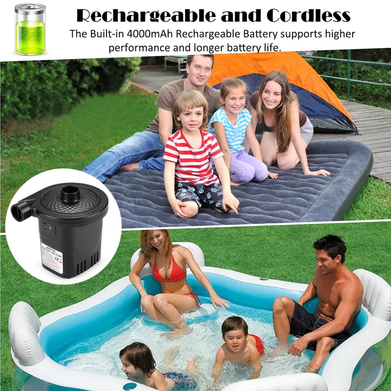 - ♦ WIDE APPLICATION -- With a rechargeable battery and wireless operation of this electric air pump, it allows you to pack in a quick way and use it for various inflatable products , such as swim tubes, inflatable sofas, airbeds, inflatable boats, air mattresses, pool toys, vacuum bags and bounce houses and more.