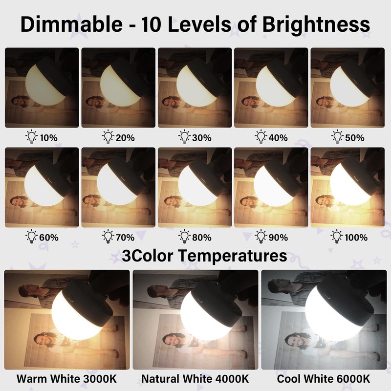 • 15 Colors Selectable & Dimmable: These upgraded rechargeable LED light bulbs offer warm white,natural white,cool white,and 12 RGB colors with 10 dimmable brightness levels,allowing you to create different atmospheres to suit your needs.