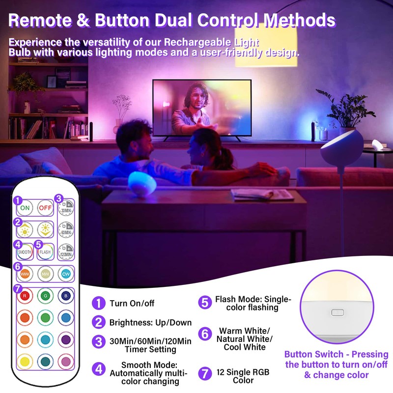 - 15 Colors Selectable & Dimmable: These upgraded rechargeable LED light bulbs offer warm white,natural white,cool white,and 12 RGB colors with 10 dimmable brightness levels,allowing you to create different atmospheres to suit your needs.