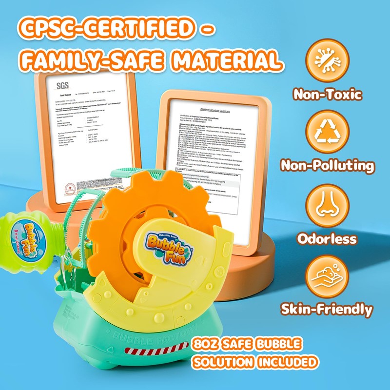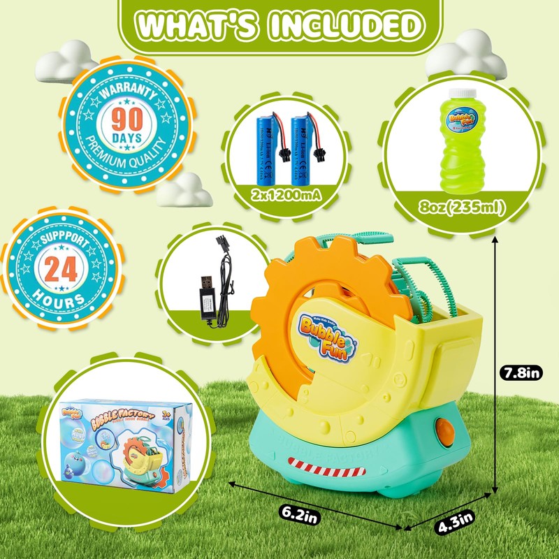 - Worry-Free Play with Non-Toxic Bubbles: Let your kids enjoy bubble fun without worries! Our bubble machine includes an 8oz bottle of premium, non-toxic bubble solution—odorless, safe for kids, pets, and the environment. Parents can relax while little ones play under the sun. It’s safe, wholesome fun you can trust.