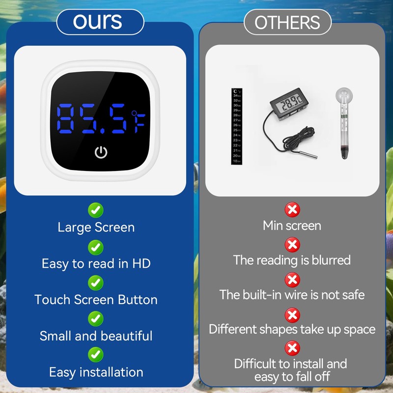 - Easy Installation: The compact design of the aquarium thermometer and the included strong adhesive make it easy to place in any desired location outside the tank. Long press the touch button to switch between Fahrenheit and Celsius adds to the user-friendly design, catering to a diverse audience.