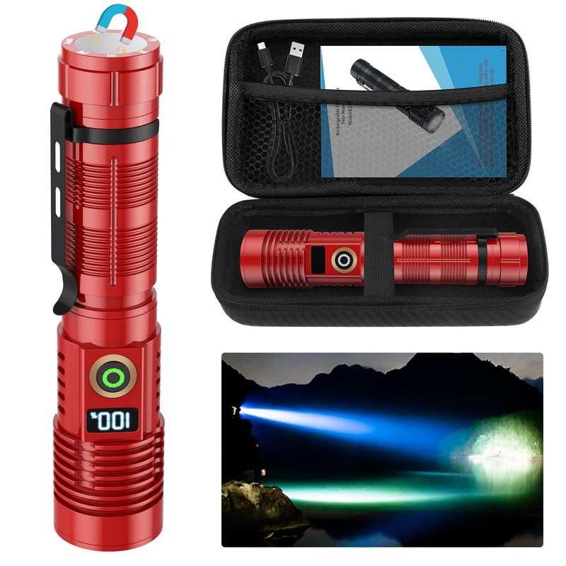 Rechargeable Flashlight High Lumens- Super Bright Magnetic Flash Light with Power Digital Display, Long Range,Dimmable,Waterproof,Pocket Tactical LED Flashlights for Emergency,Red 1PC