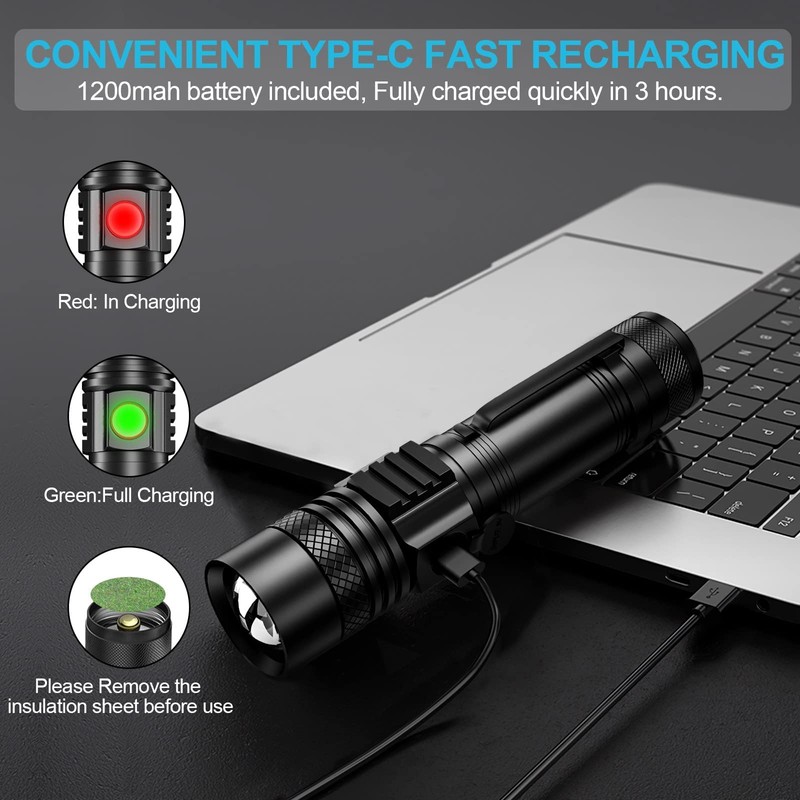 - 【USB Rechargeable Flashlight】:This USB rechargeable flashlight can be fully charged within 3 hours through any USB port, such as computer, mobile power supply, car charger, etc. This high lumen rechargeable flashlight can work for up to 10 hours (low mode);UL certification upgrades overcharge protection, and the flashlight will stop charging when fully charged, so there is no need to worry about safety when forgetting to charge the flashlight.