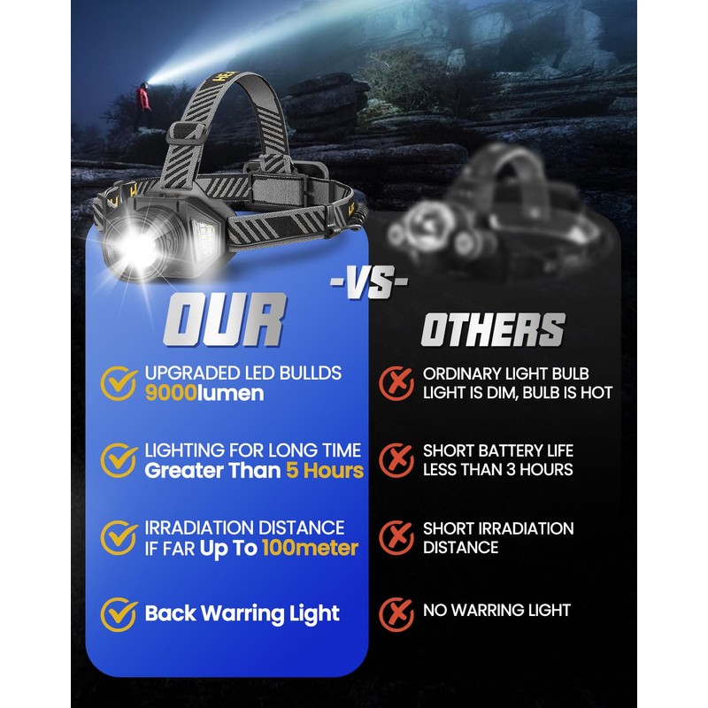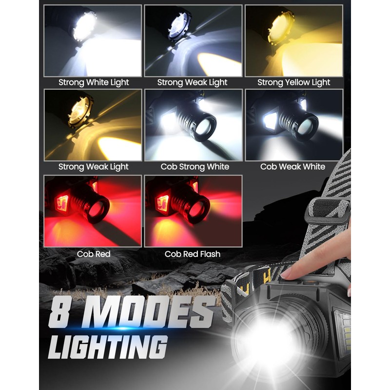 • 【Dual Light Source Beads】 Brighten every adventure with this powerful headlamp! Featuring white and red LEDs, it ensures clear visibility with white light and enhanced underwater clarity with yellow light. With 9000 lumens of tested brightness, it’s the perfect tool for your next outdoor journey.