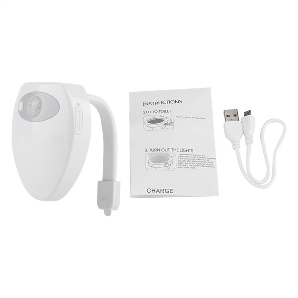 1、Make your bathroom easy to access via the auto-sensing device, smart and considerate. 2、Easier for you to find toilet, with 8 different colors of light indicate the position of the toilet. 3、The arm of the led toilet night light is flexible, soft neck can be bent to fit on any size toilet bowl. 4、Pressing the button, you can set a single color to fit your mood, then press the button again for to recover color-cycle mode, long press for 3 seconds to shut down. 5、8 colors, 120 seconds, each color random for 15 seconds.