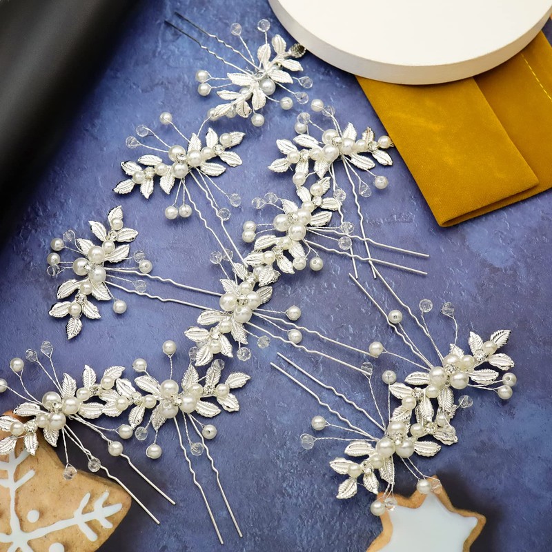 RechicGu 10 Pieces Wedding Head Hair Piece Leaf Flower Faux Pearls Bride Hair Pins Clips Bridal Hair Bridesmaid Hairstyle Accessories for Women Girls (Silver)