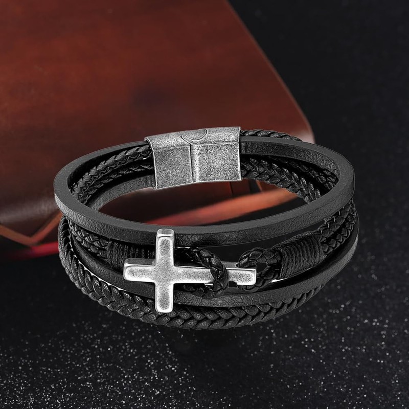 - VERSATILE DESIGN: Multi-layered bracelet featuring genuine braided leather strands and a distinctive silver-toned cross charm, available in black, brown, or navy blue