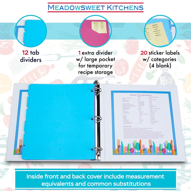 - UNIQUE DESIGN: The front of our recipe binders feature an attractive design. The inside front and back cover include handy measurement equivalents and common substitutions. We have a variety of recipe pages available for purchase that fit in this standard 3-ring binder, that will hold any or all of your 8 1/2" x 11" full page recipes, recipe clippings, and 4 x 6 or 3 x 5 recipe cards.