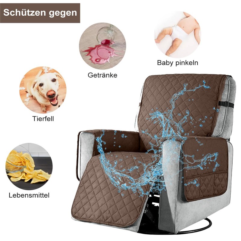 Recliner Chair Cover Pad with 6 Side Pockets, Reclining Chair Adjustable Soft Non-slip Buckles Protective Armchair Sofa Cushion Protector for Home with Children and Pets Dog (Small, Dark Brown)