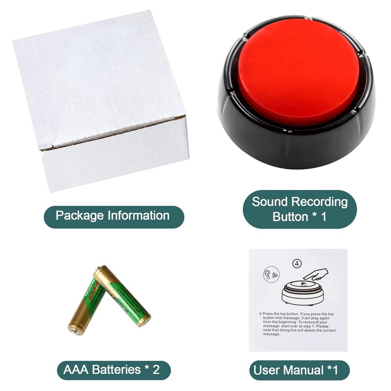 - 30 Seconds Recording: Communication Button is a recording button that allows to record up to 30 seconds, recording longer than other talking buttons. This custom sound button is a must for your party games or communicating with your pet