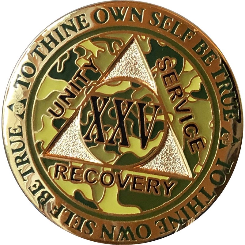 - 25 Year AA Sobriety Medallion In Reflex Camo Gold Plated With Serenity Prayer On The Back