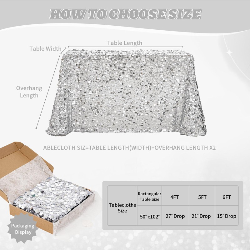 - Silver Sequin Tablecloth: 1 pack of glitter tablecloths measuring 50x102 inches (8 feet long), which is long enough to fit any round, rectangular or square table.