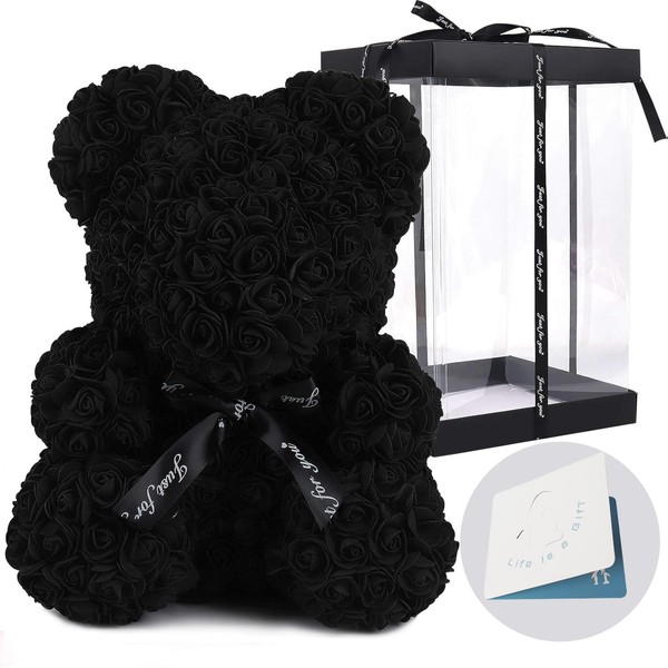 RECUTMS Artificial Rose Bear Flowers Rose Teddy Bear 10 inch Wedding Party Decoration Box for Valentines Day Gift Mothers Day Anniversary Birthday Present (Black)