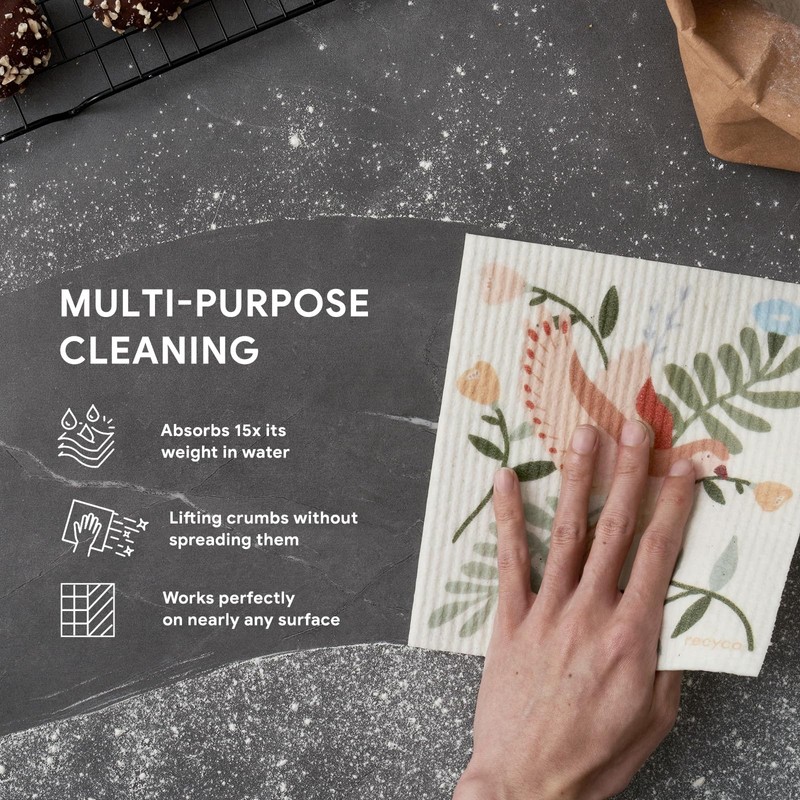 RECYCO Swedish Dishcloths for Kitchen | 6 Packs Birdsong and Blooms Washable Dish Rags | Cellulose Reusable Cleaning Paper Towels | Absorbent Counter Dish Cloth Sponge Kitchen Wipes, 8" L x 7" W