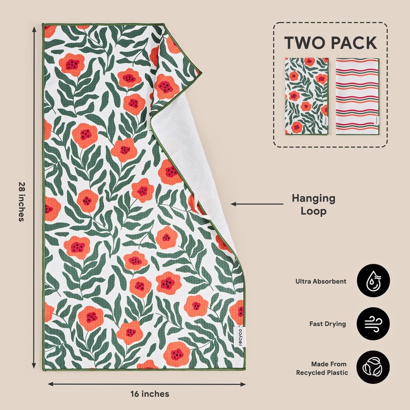RECYCO Waffle Kitchen Towel Set of 2 - Quick Dry Microfiber Sustainable Dish Towels - Ultra Absorbent Reusable Cleaning Tea Towels - Lightweight Hand Towels,16”x 28”, Poppy Waves