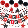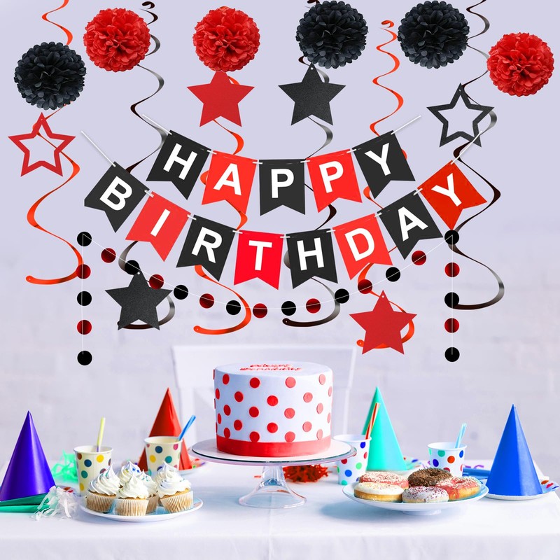 - Red and Black Birthday Decorations Set: Birthday Decorations Ornaments, includes 6 Pom Pom Papers + HAPPY BIRTHDAY Banner + 13.2 Feet red and black Circle Dot Garland + 6 Star Swirl Streamers, you can enjoy the perfect surprise party , No need to worry about running around and searching for individual items, we've got you covered.